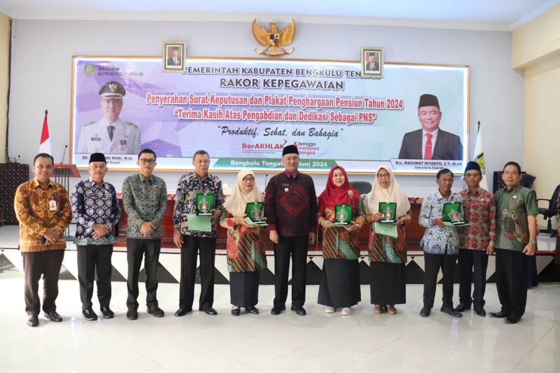 PJ. Bupati Bengkulu Tengah Dr. Heriyandi Roni, M.Si., menyerahkan secara langsung Surat Keputusan (SK) dan Plakat Penghargaan Pensiun Tahun 2024 kepada 94 peserta Aparatur Sipil Negara (ASN).