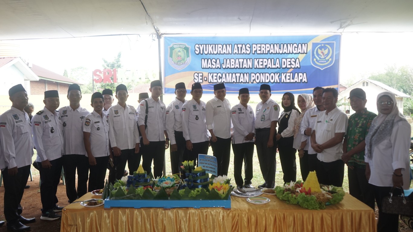 Setelah sambutan berlangsung Sekretaris Daerah beserta jajaran melakukan potong tumpeng syukuran atas perpanjangan masa jabatan kepala desa se-Kecamatan Pondok Kelapa. (MC/EK)
