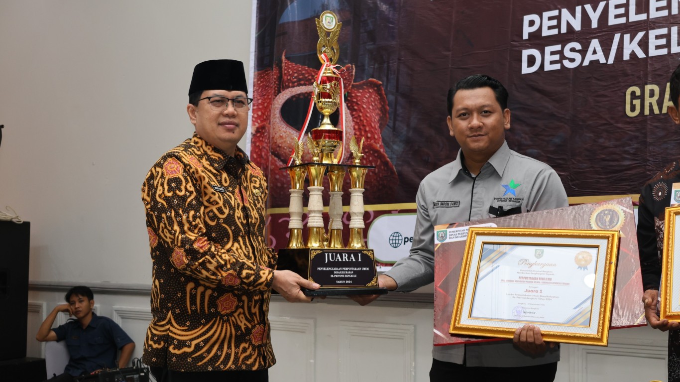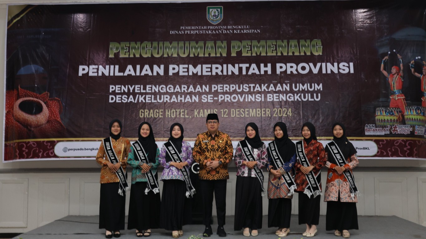 Bengkulu, MC Benteng - Pemerintah Kabupaten Bengkulu Tengah melalui Asisten Bidang Administrasi Umum H. Elyandes Kori, S.E., M.Si., didampingi Kadis Pusip Agung Budiyanto, S.E., M.E., menghadiri acara pengumuman pemenang lomba perpustakaan desa/kelurahan se-Provinsi Bengkulu dan pengukuhan duta baca Provinsi Bengkulu tahun 2024-2027 di Grage Hotel Bengkulu. Kamis (12/12/2024).