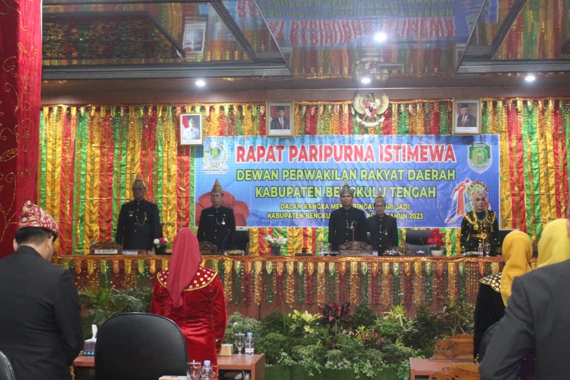 BENGKULU TENGAH- Dalam rangka memperingati hari jadi Kabupaten Bengkulu Tengah ke 15 dengan tema" "Kita Satukan Tekad Untuk Bengkulu Tengah Maju dan Sejahtera." Dewan Perwakilan Rakyat (DPRD) menggelar rapat Paripurna Istimewa. Bertempat di Ruang Gunung Bungkuk Kantor DPRD Kabupaten Bengkulu Tengah pada Sabtu (24/06).