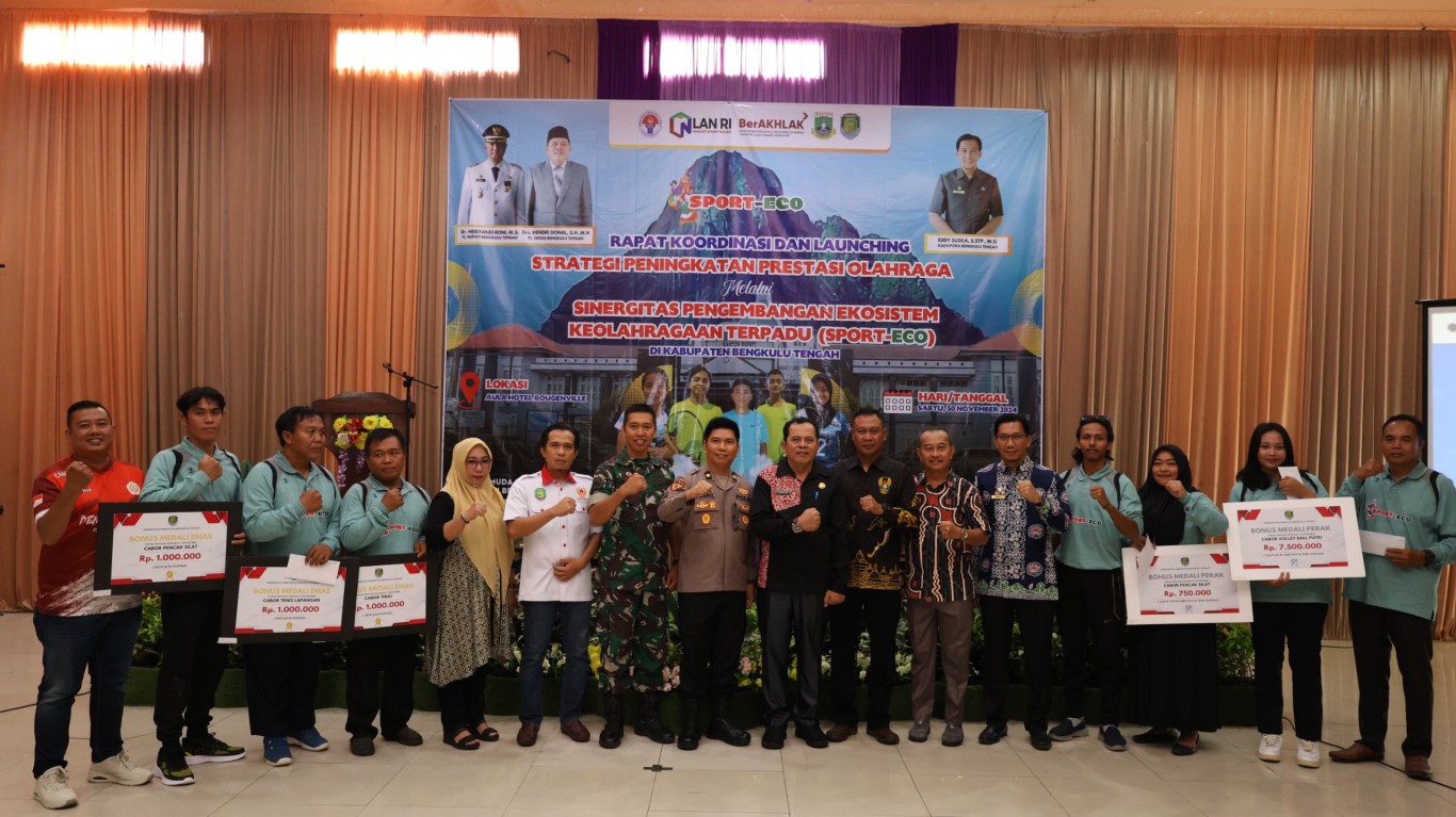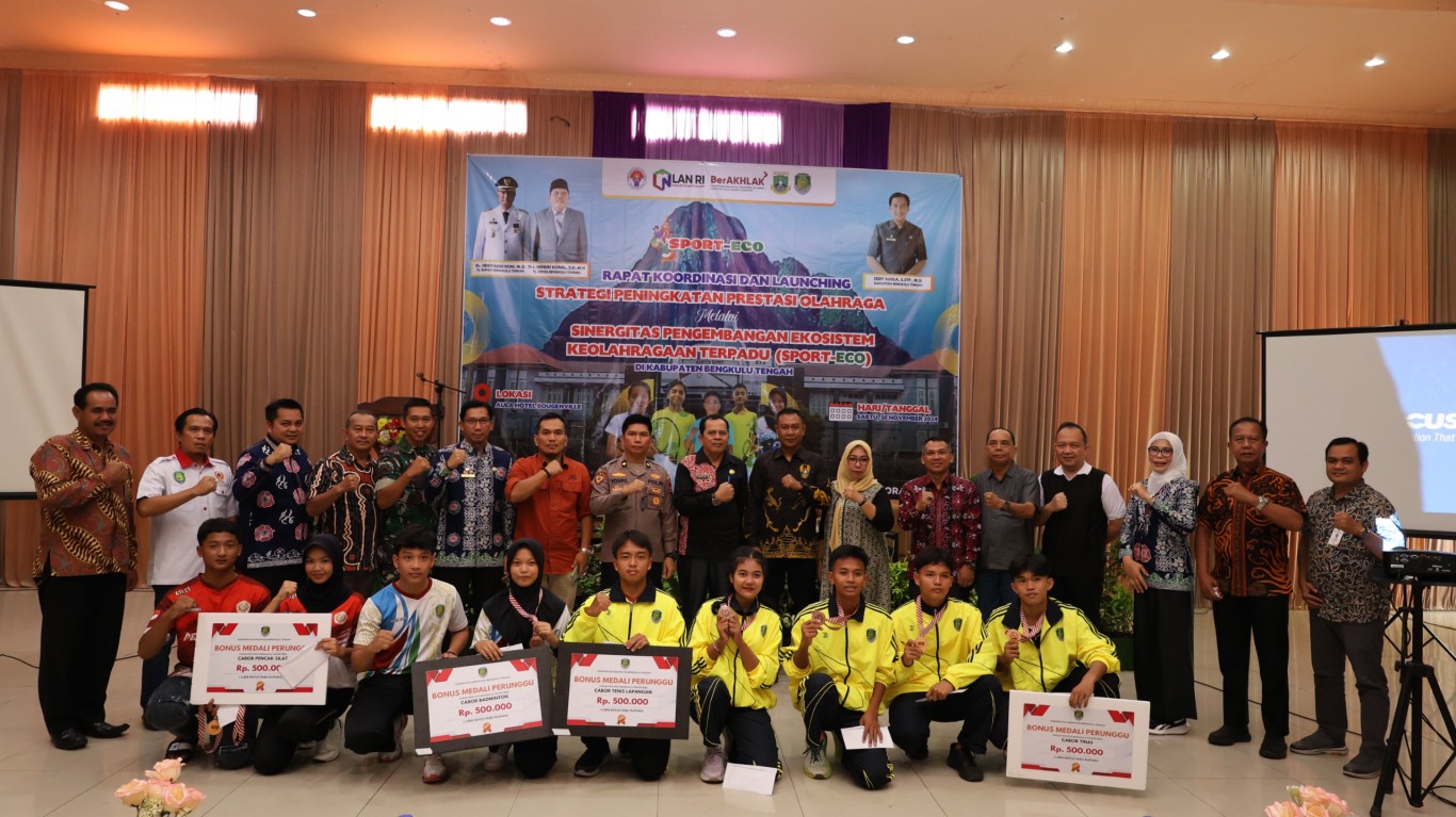 Bengkulu, MC Benteng - Pemerintah Kabupatenb (Pemkab) Bengkulu Tengah melalui Dinas Pemuda dan Olahraga (Dispora) menggelar rapat koordinasi (Rakor) dan launching implementasi proyek perubahan "Strategi Peningkatan Prestasi Olahraga Melalui Sinergitas Pengembangan Ekosistem Olahraga Terpadu" (SPORT-ECO) sekaligus penyerahan penghargaan bagi atlet dan pelatih berprestasi pada event Pekan Olahraga Pelajar Daerah (POPDA) Provinsi Bengkulu Tahun 2024, di ballroom hotel Grand Bougenville Pantai Panjang Bengkulu. Sabtu (30/11/2024).