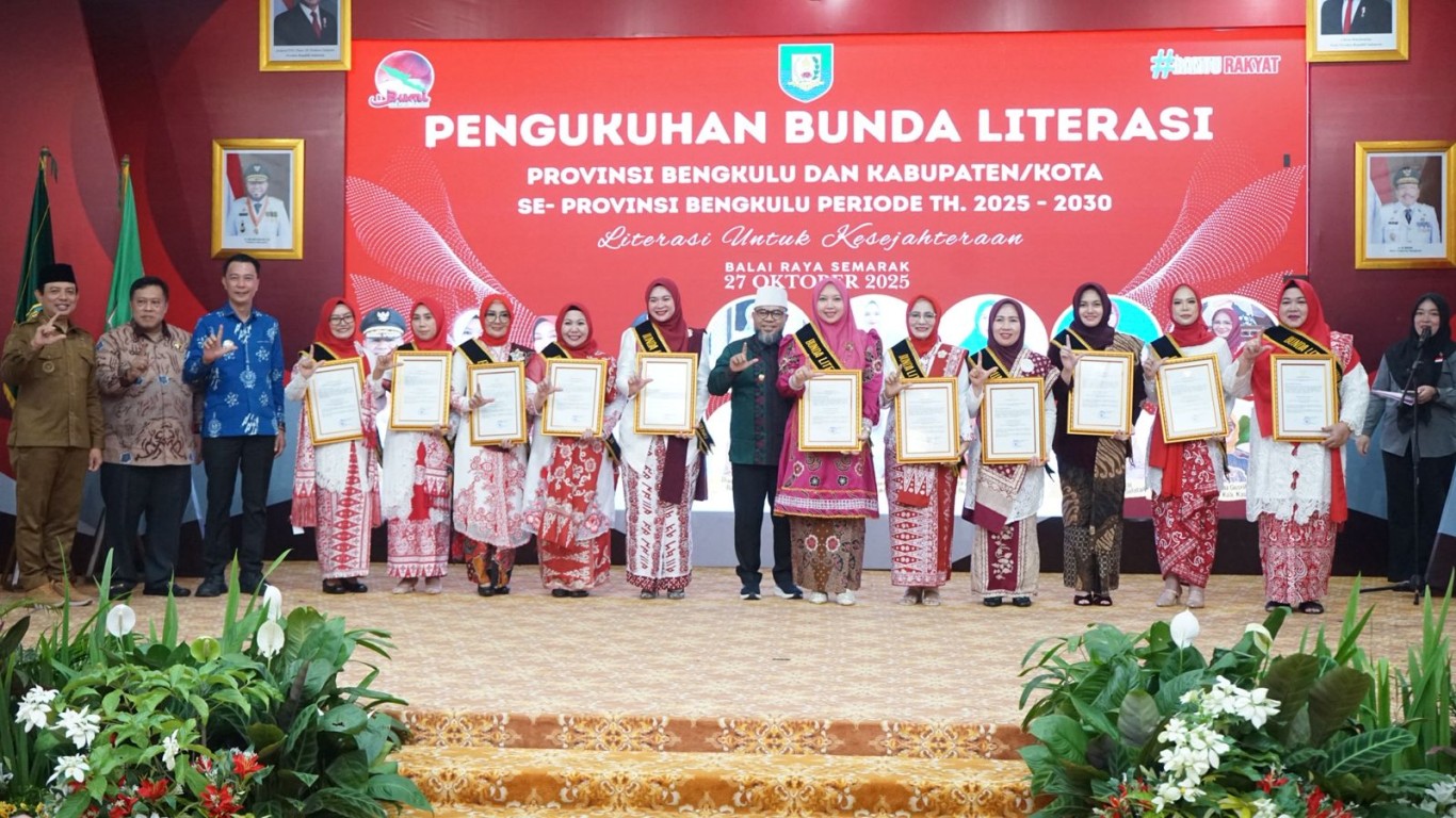 Bengkulu,MC Benteng — Dr. Susilo Damarini Rachmat,.S.KM.,M.PH., dikukuhkan langsung oleh Gubernur Bengkulu H. Helmi Hasan, S.E., sebagai Bunda literasi Kabupaten Bengkulu Tengah periode 2025-2030 bersama Bunda literasi Kabupaten/Kota se-Provinsi Bengkulu bertempat di Balai Raya Semarak . Senin pagi (27/10/2025)