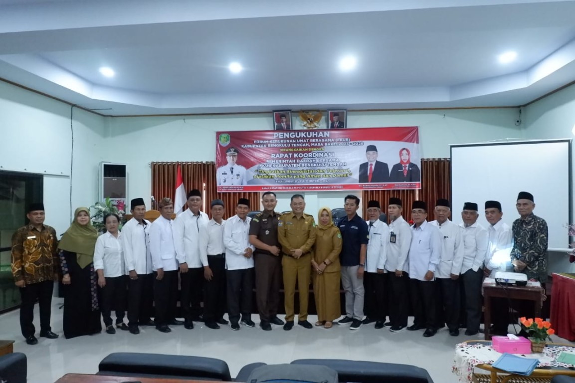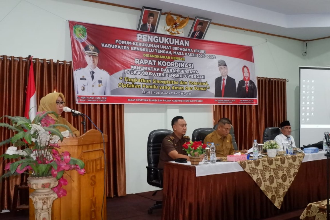 Selain pengukuhan FKUB Kabupaten Bengkulu Tengah kegiatan tersebut juga dilanjutkan dengan Rapat Koordinasi (Rakor) dengan Pemerintah Daerah dengan tema “ Tingkatkan Sinergitas dan Toleransi, Ciptakan Pemilu Yang Aman dan Damai” di Aula Balai Sindu, Selasa (31/10/2023).