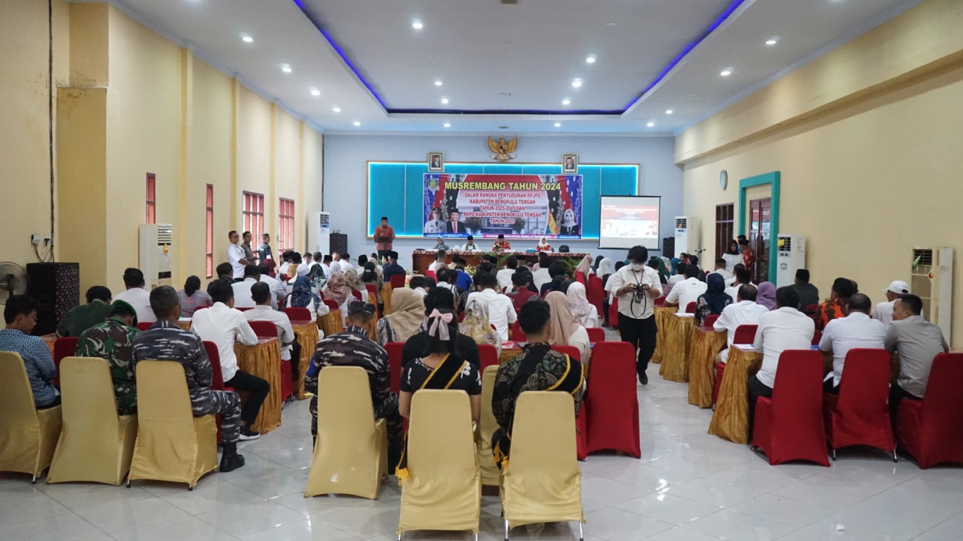Bengkulu Tengah, MC Benteng - Pemerintah Kabupaten Bengkulu Tengah melalui Badan Perencanaan dan Pembangunan Daerah (Bappeda) melaksanakan Musyawarah Rencanan Pembangunan (Musrenbang) tahun 2024 dalam rangka penyusunan Rancangan Pembangunan Jangka Panjang Daerah (RPJPD) tahun 2025-2045 dan Rencana Kerja Perangkat Daerah (RKPD) tahun 2025 bertempat di Aula Puncak Hotel Tahura Kecamatan Pondok Kubang. Rabu (27/3/2024)