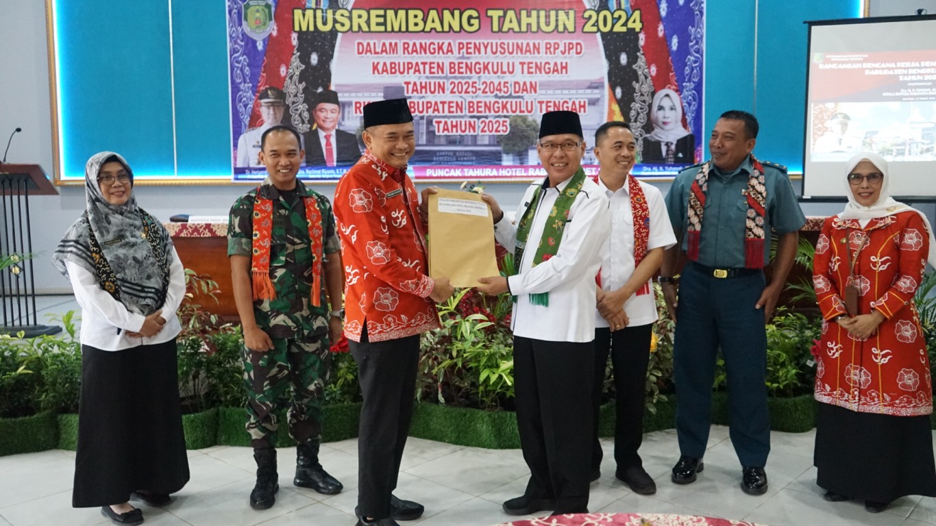 " Alhamdulilah, usulan RPJPD tahun 2025-2045 dan RKPD tahun 2025 dari Kabupaten Bengkulu Tengah telah di serahkan secara resmi. Semoga dengan usulan-usulan yang telah tersusun dapat secara berkala di proses dan masuk dalam kategori di dahulukan pada Musrenbang tingkat Provinsi 1 April 2024 mendatang. Selain itu, pemerintah daerah harus dapat menjadikan Kabupaten Bengkulu Tengah menjadi Kabupaten penyangga dari ibu kota Provinsi, sehingga perkembangan pembangunan harus dapat di utamakan," jelasnya