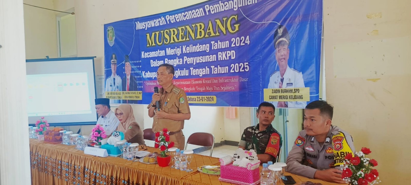 Bengkulu Tengah - Rencana Pembangunan Kecamatan (Musrenbangcam) dalam rangka penyusunan Rencana Kerja Pemerintah Daerah (RKPD) tahun 2025 di Merigi Kelindang tuntas dilaksanakan. Kegiatan tersebut dihadiri langsung oleh Sekda Bengkulu Tengah, Drs. Rachmat Riyanto, S.T.,M.AP, Selasa (23/01/2023).