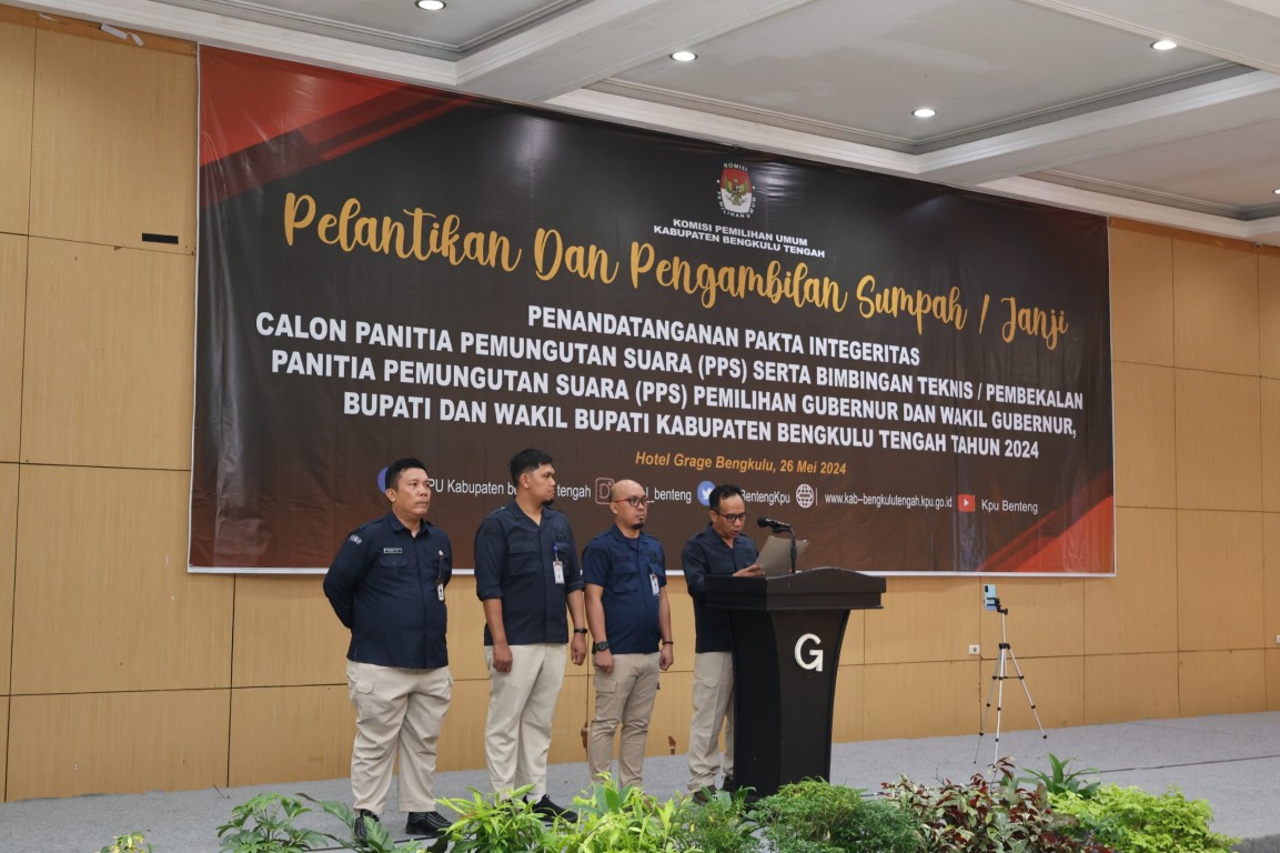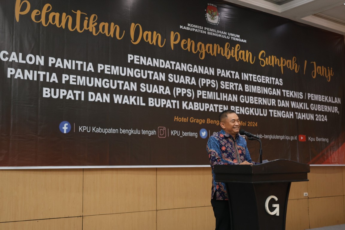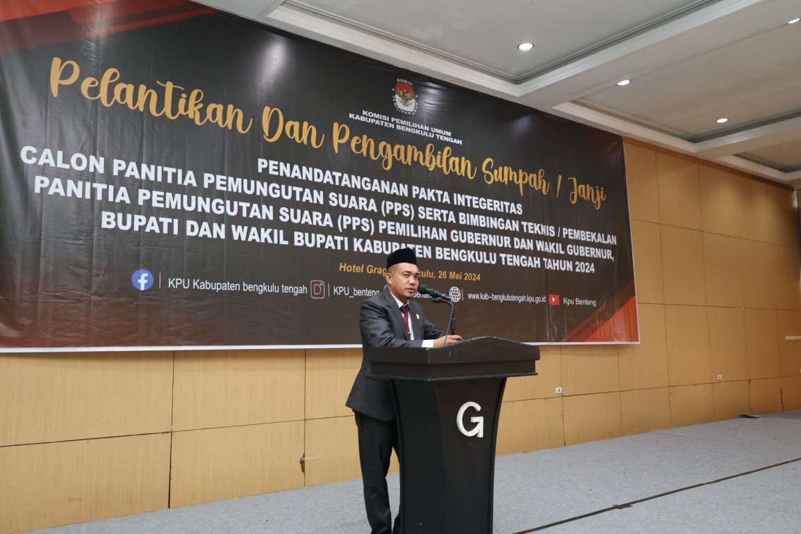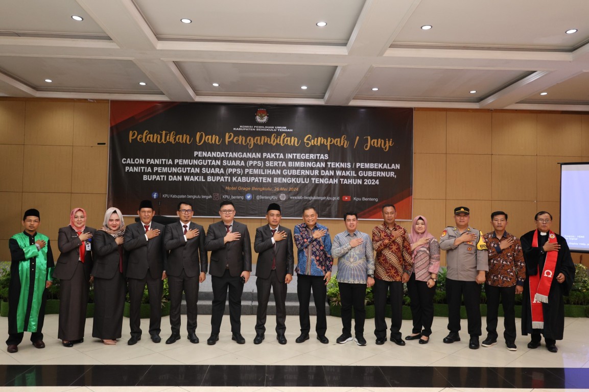 Bengkulu - Pemerintah Kabupaten Bengkulu Tengah melalui Sekretaris Daerah Drs. Rachmat Riyanto, S.T., M.AP., menghadiri Pelantikan dan Pengambilan Sumpah Janji Anggota Panitia Pemungutan Suara (PPS) pada penyelenggaraan pemilian Gubernur/Wakil Gubernur dan Bupati/Wakil Bupati dan Walikota/Wakil Walikota tahun 2024 di Ballroom Hotel Grage Horizon Bengkulu. Minggu (26/05/2024)