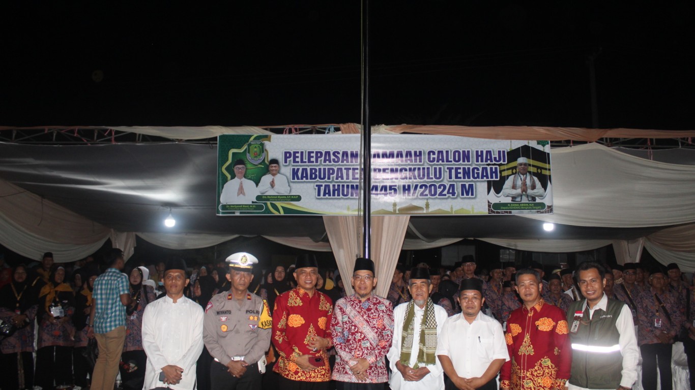 Bengkulu Tengah, MC Benteng - Pemerintah Daerah Kabupaten Bengkulu Tengah melalui Asisten Administrasi Umum H. Elyandes Kori, S.E.,M.Si., menghadiri acara pelepasan para jamaah calon haji tahun 2024 dari Kabupaten Bengkulu Bengkulu Tengah yang berlangsung di Halaman Kantor Bupati. Senin (13/5/2024)