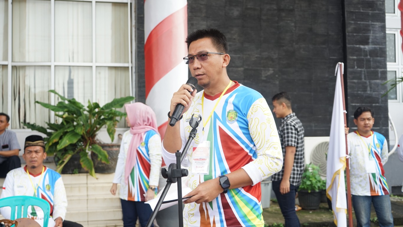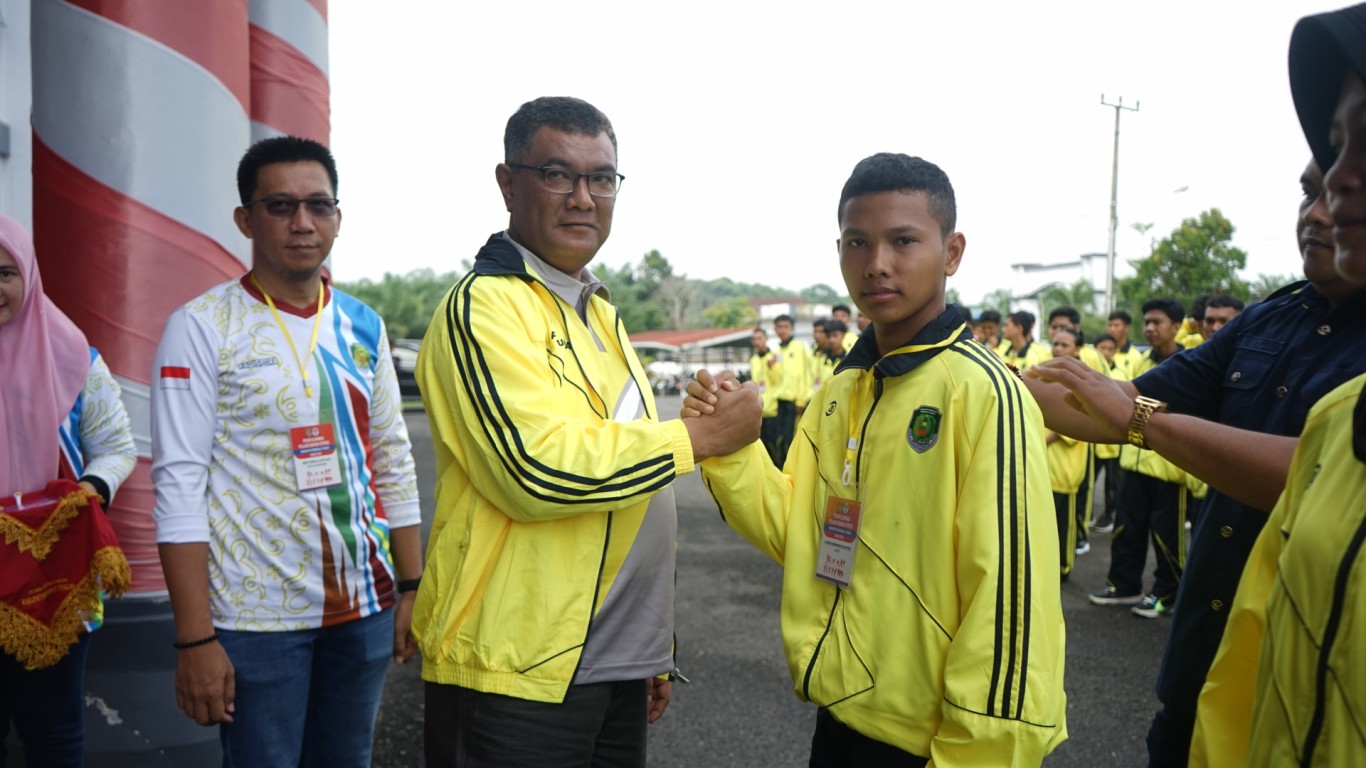 Pj. Bupati Bengkulu Tengah Heri Roni melepas secara langsung para atlet dengan memberikan kartu pengenal peserta secara simbolis kepada atlet dan pelatih serta menyerahkan Lambang pemerintah Daerah kepada Kadispora untuk di bawah langsung ke event Popda tersebut. Demikian (MC/EK)