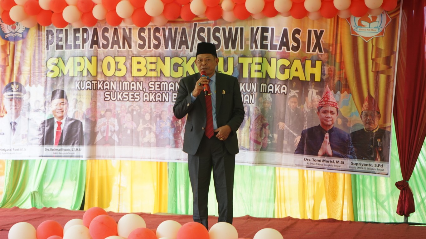 " Pada acara pelepasan siswa-siswi SMP negeri 3 Bengkulu Tengah pada hari ini sungguh luar biasa, karena para siswa-siswi disini juga menampilkan berbagai kreatifitas dan kemampuan yang dimiliki. Saya juga menginginkan kepada seluruhnya untuk tetap melanjutkan pendidikan hingga ke jenjang yang lebih tinggi, jangan ada yang terhenti sampai disini bagaimanapun caranya. Kita ketahui bahwa pengisi dari Indonesia Emas tahun 2024 mendatang adalah generasi-generasi penerus yang bersekolah pada saat ini, kemajuan daerah maupun negara ada di anak-anak kita semua pada saat ini," ungkapnya
