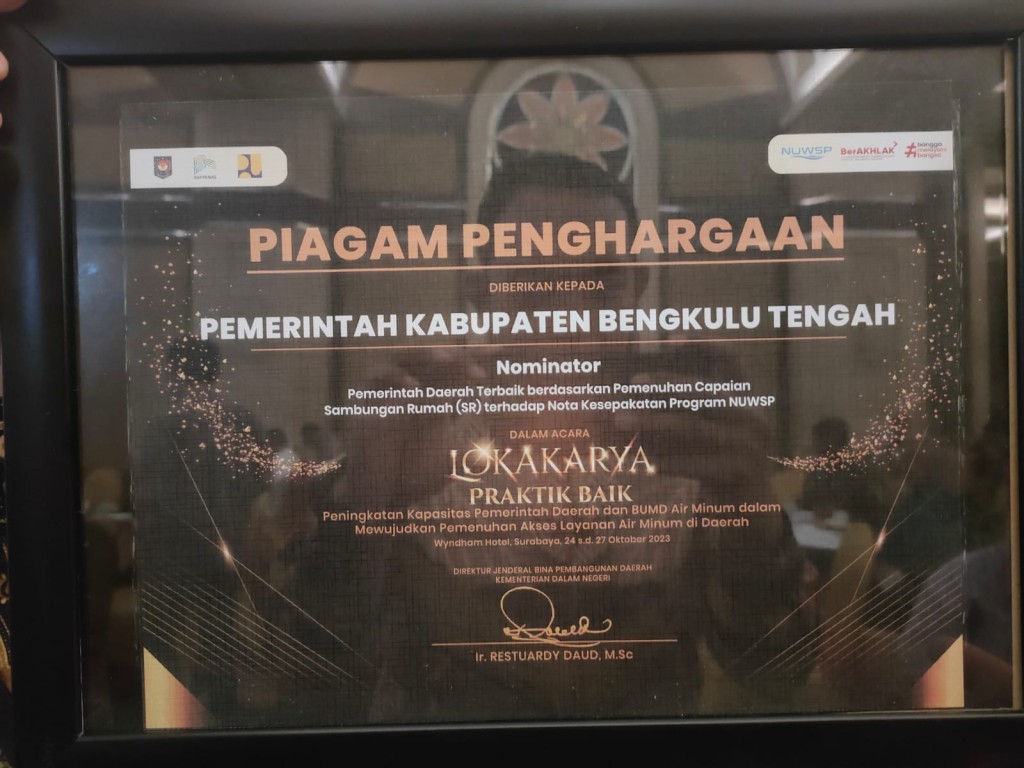 Jakarta, MC Benteng - Pemerintah Kabupaten Bengkulu Tengah menerima piagam penghargaan dari Kementerian Dalam Negeri (Kemendagri) RI atas capaian Sambungan Rumah (SR) terhadap nota kesepakatan Program NUWSP tahun 2023.