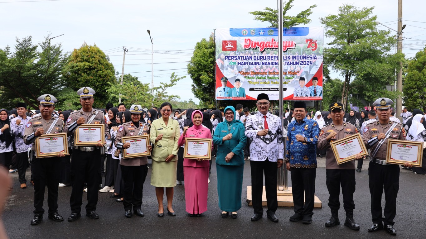 Setelah rangkaian acara upacara selesai dilanjutkan dengan pembagian piagam penghargaan kepada delapan orang guru yang sudah purna bakti, pembagian piagam penghargaan kepada anggota Polres Bengkulu Tengah dan pemotongan tumpeng dalam rangka peringatan Hari Guru Nasional, HUT PGRI ke 79 dan HUT KORPRI tahun 2024. (MC/BDR)