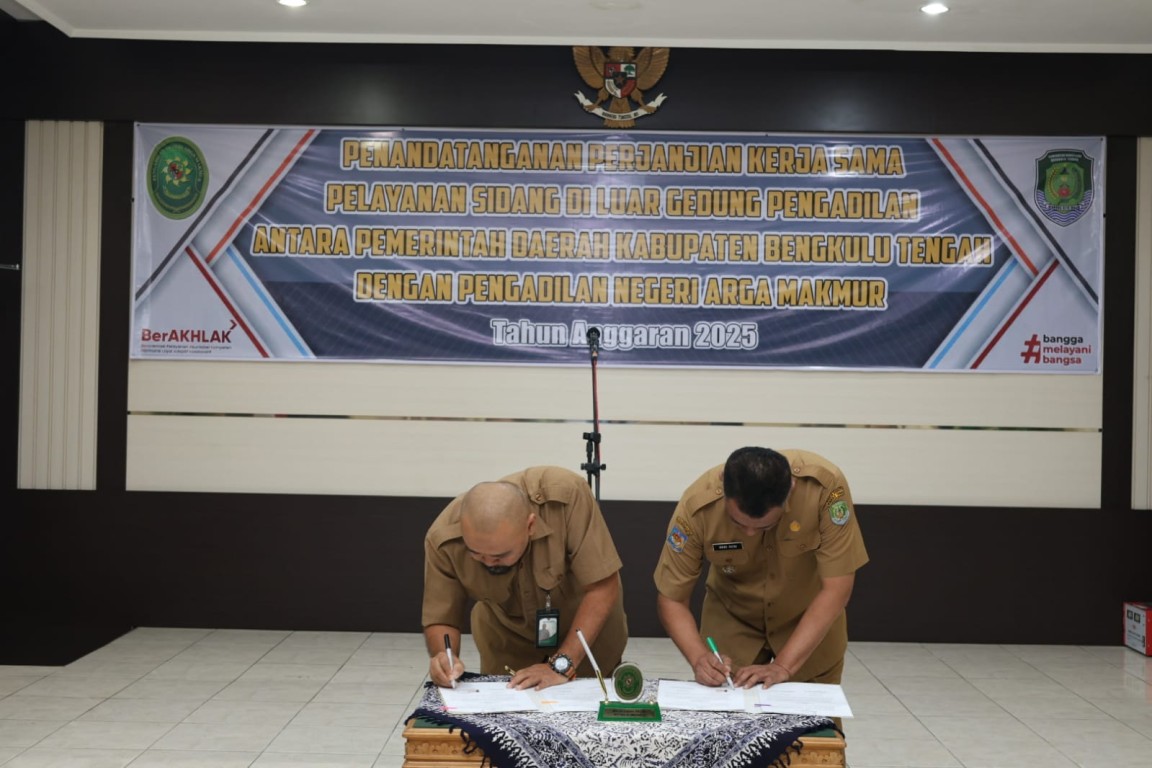 Arga Makmur, MC Benteng - Pj Bupati Bengkulu Tengah Dr.Heriyandi Roni M.Si bersama Ketua Pengadilan Negeri Arga Makmur Darmo Wibowo Mohamad, S.H., M.H., menandatangani perjanjian kerja sama pelayanan sidang di luar gedung pengadilan antara Pemerintah Kabupaten Bengkulu Tengah dengan Pengadilan Negeri Arga Makmur di Kantor Pengadilan Negeri Arga Makmur. Selasa (04/02/2025)