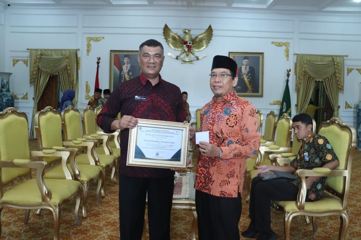 Penyerahan piagam penghargaan tersebut langsung diterima oleh Pj Bupati Bengkulu Dr. Heriyandi Roni, M.Si yang didamping juga oleh Asisten Adm. Umum H. Elyandes Kori, S.E.,M.Si.