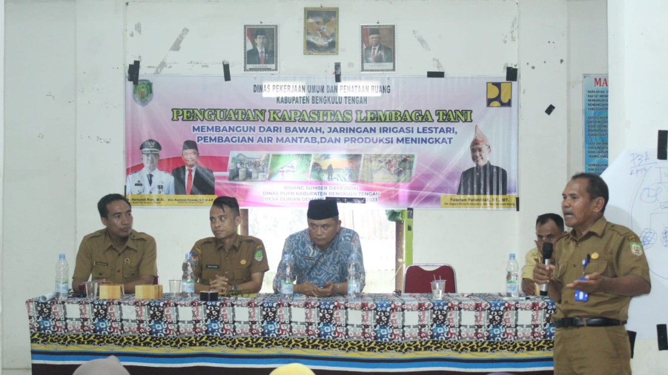 Adapun tema kegiatan tersebut yaitu membangun dari bawah, jaringan irigasi lestari, pembagian mantab dan produksi meningkat di Desa Durian Demang, Senin (04/12/2023).
