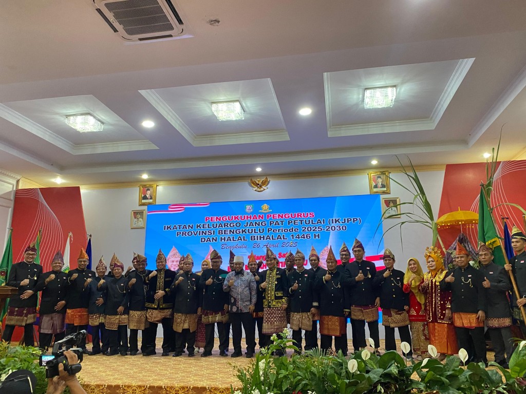 Bengkulu Tengah, MC Benteng - Bupati Bengkulu Tengah Drs.Rachmat Riyanto, S.T., M.AP dan Wakil Bupati Bengkulu Tengah Tarmizi S.Sos menghadiri Pengukuhan Kepengurusan Ikatan Keluargo Jang Pat Petulai (IKJPP) periode 2025-2030 dan halal bihalal 1446 H di Balai Raya Semarak Provinsi Bengkulu pada Sabtu (26/4/2025).
