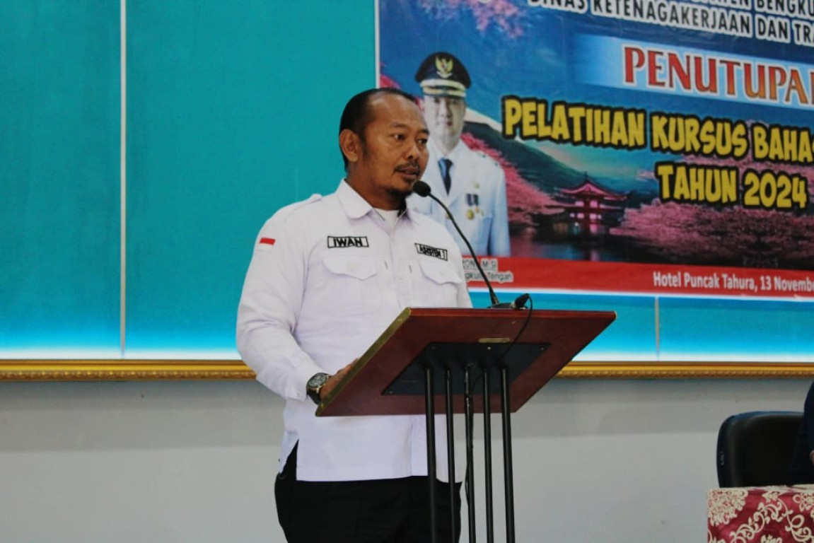 Bengkulu Tengah, MC Benteng - Pemerintah Kabupaten Bengkulu Tengah melalui Asisten Bidang Pemerintahan dan Kesra Nurul Iwan Setiawan, S.Sos.,M.Si., menutup program pelatihan kursus bahasa Jepang kerjasama antara Dinas Ketenagakerjaan dan Transmigrasi (Disnakertrans) Kabupaten Bengkulu Tengah (Benteng) dengan LPK Kaizu Hamagi Gakkou yang berlangsung di Aula Puncak Hotel Tahura Bengkulu Tengah. Rabu (13/11/2024)