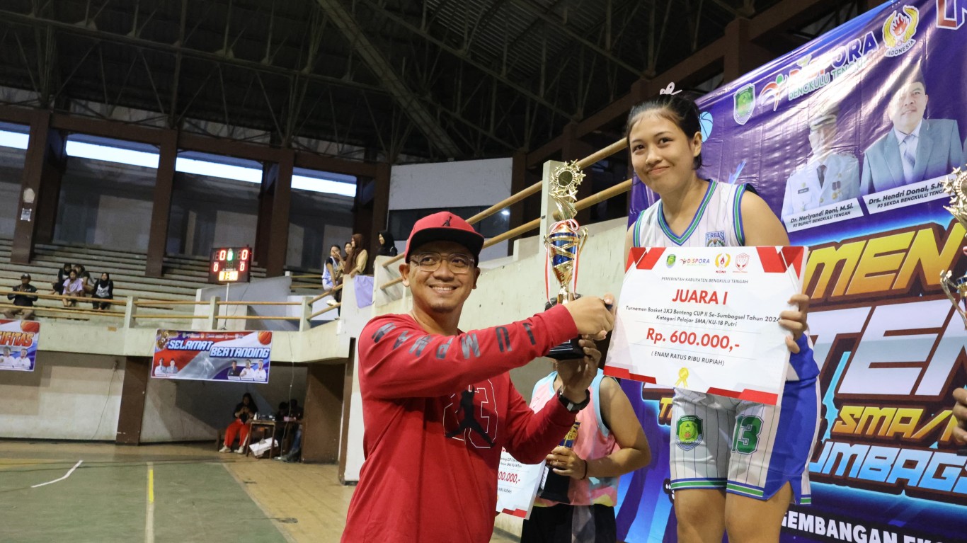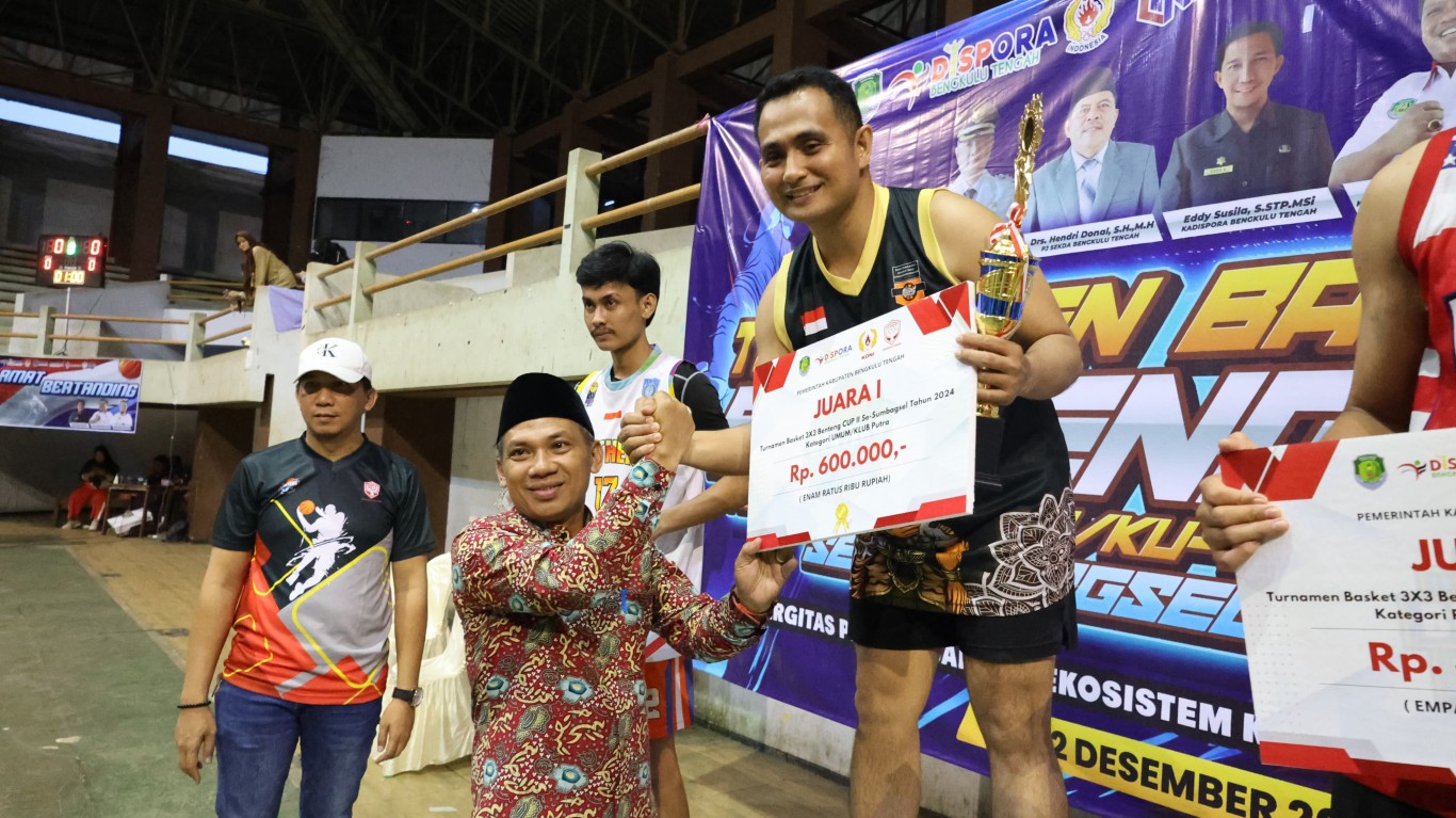 Bengkulu, MC Benteng – Pemerintah Kabupaten Bengkulu Tengah melalui Staf Ahli Bidang Ekonomi Keuangan dan Pembangunan Sugeng Oswari, S.Kom.,M.Si., menghadiri sekaligus menutup acara Turnamen Basket 3x3 BENTENG CUP II Se-SUMBAGSEL (Sumatera Bagian Selatan) Tahun 2024 di GOR Sawah Lebar Kota Bengkulu. Kamis (12/12/2024).
