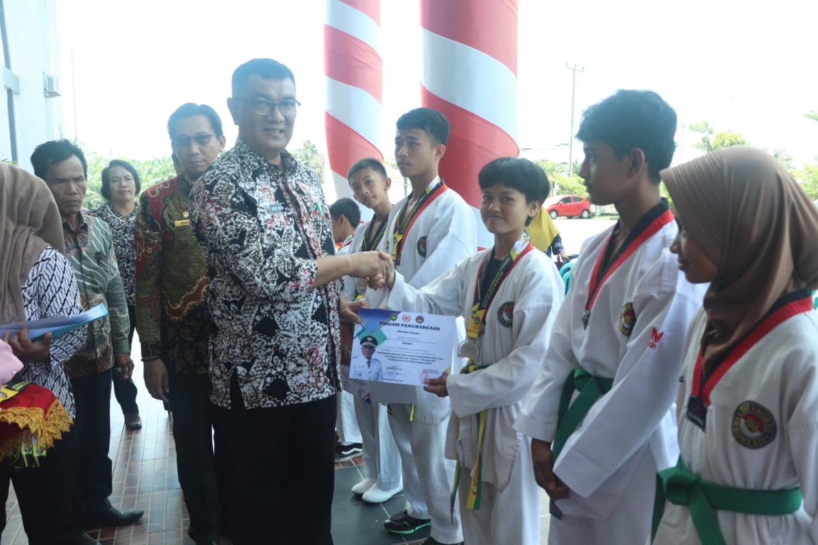 Bengkulu Tengah, MC Benteng - Penjabat Bupati Bengkulu Tengah Dr. Heriyandi Roni, M.Si.,menyerahkan medali dan piagam atas prestasi Atlet Taekwondo Bengkulu Tengah yang meraih prestasi pada Kejuaraan Taekwondo Open Turnamen Bupati Bengkulu Selatan CUP II tahun 2023 yang berlangsung Halaman Kantor Bupati Bengkulu Tengah. Kamis Siang (14/12/2023)