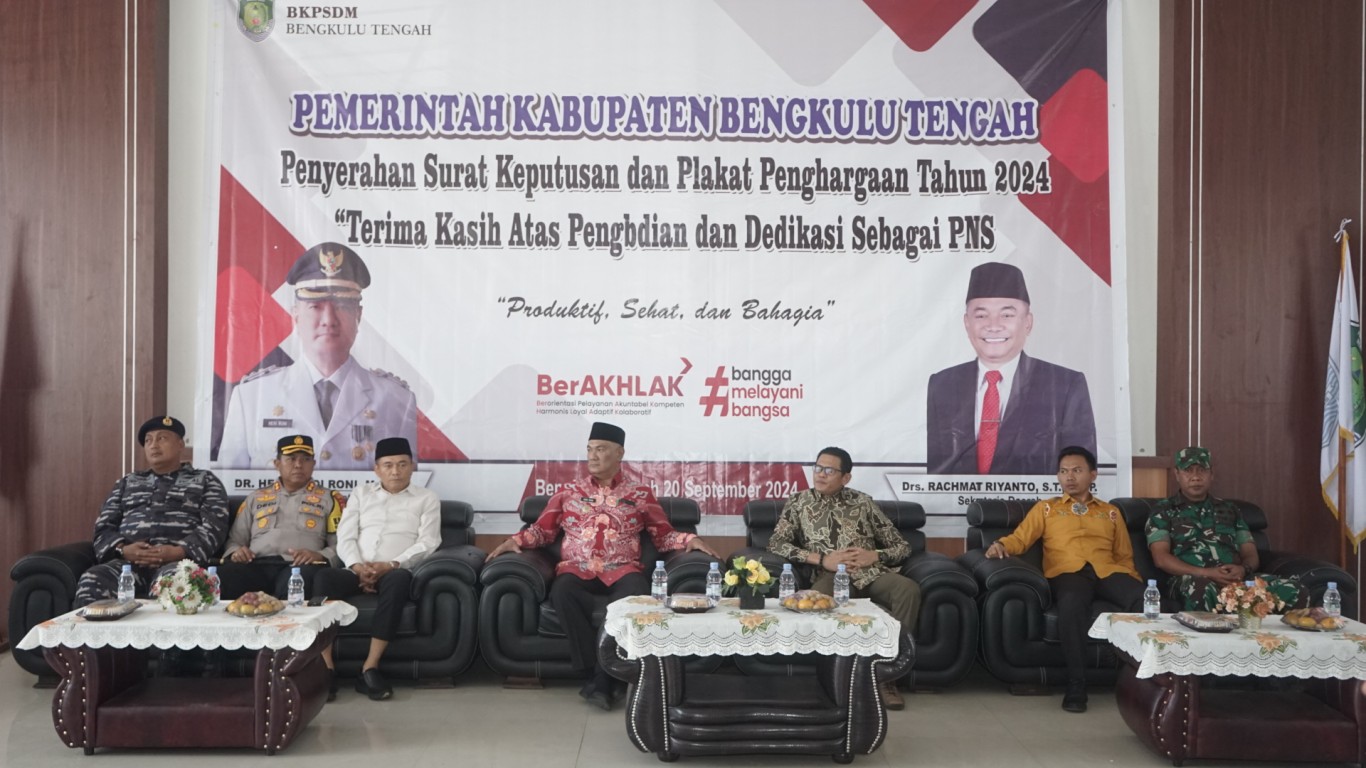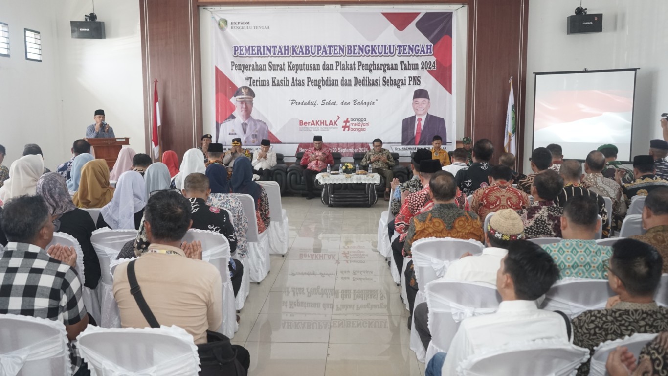 Bengkulu Tengah, MC Benteng - Pemerintah Kabupaten Bengkulu Tengah melalui Badan Kepegawaian dan Pengembangan Sumber Daya Manusia (BKPSDM) melaksanakan acara pemberian Surat Keputusan (SK) Purna Tugas tehadap 3 orang PNS di Pemerintahan Kabupaten Bengkulu Tengah yang berlangsung di Pendopo Bukit Kandis. Jum'at (20/9/2024)