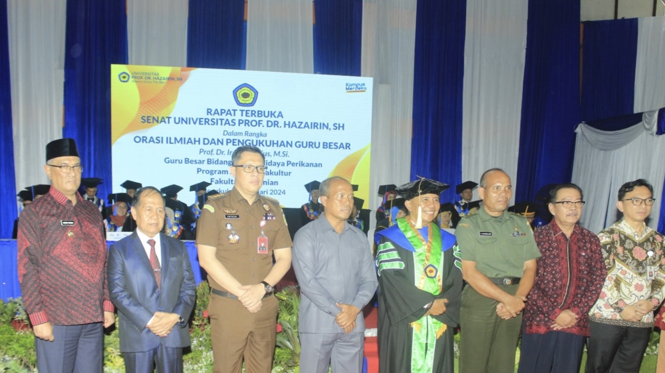 KOTA BENGKULU, MC BENTENG - PJ. Bupati Bengkulu Tengah Dr. Heriyandi Roni, M.Si., hadiri acara Pengukuhan Guru Besar Tetap Prof. Dr. Ir. Yulfiperius, M.Si., Prodi Akuakultur Fakultas Pertanian Universitas Prof. Dr. Hazairin (Unihaz) di Gedung Serba Guna Universitas Hazairin, Kamis (01/02/2024).