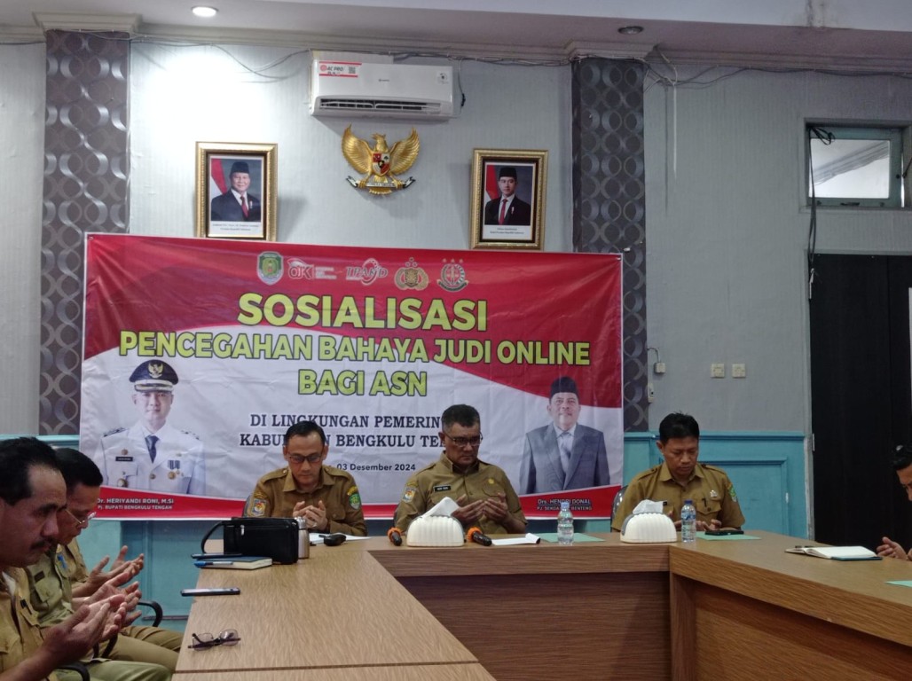 Bengkulu Tengah, MC Benteng – Pj Bupati Bengkulu Tengah Dr. Heriyandi Roni, M.Si didampingi Staf Ahli Bidang Pemerintahan Hukum dan Politik Ir. Wijaya Atmaja, M.Si, Kepala OPD bersama Tim Pengendalian Inflasi Daerah (TPID) Kabupaten Bengkulu Tengah mengikuti Rapat Koordinasi (Rakor) mingguan bersama Kementerian Dalam Negeri (Kemendagri) Republik Indonesia melalui zoom di Ruang Rapat Bupati (RRB), Selasa (03/12/2024).