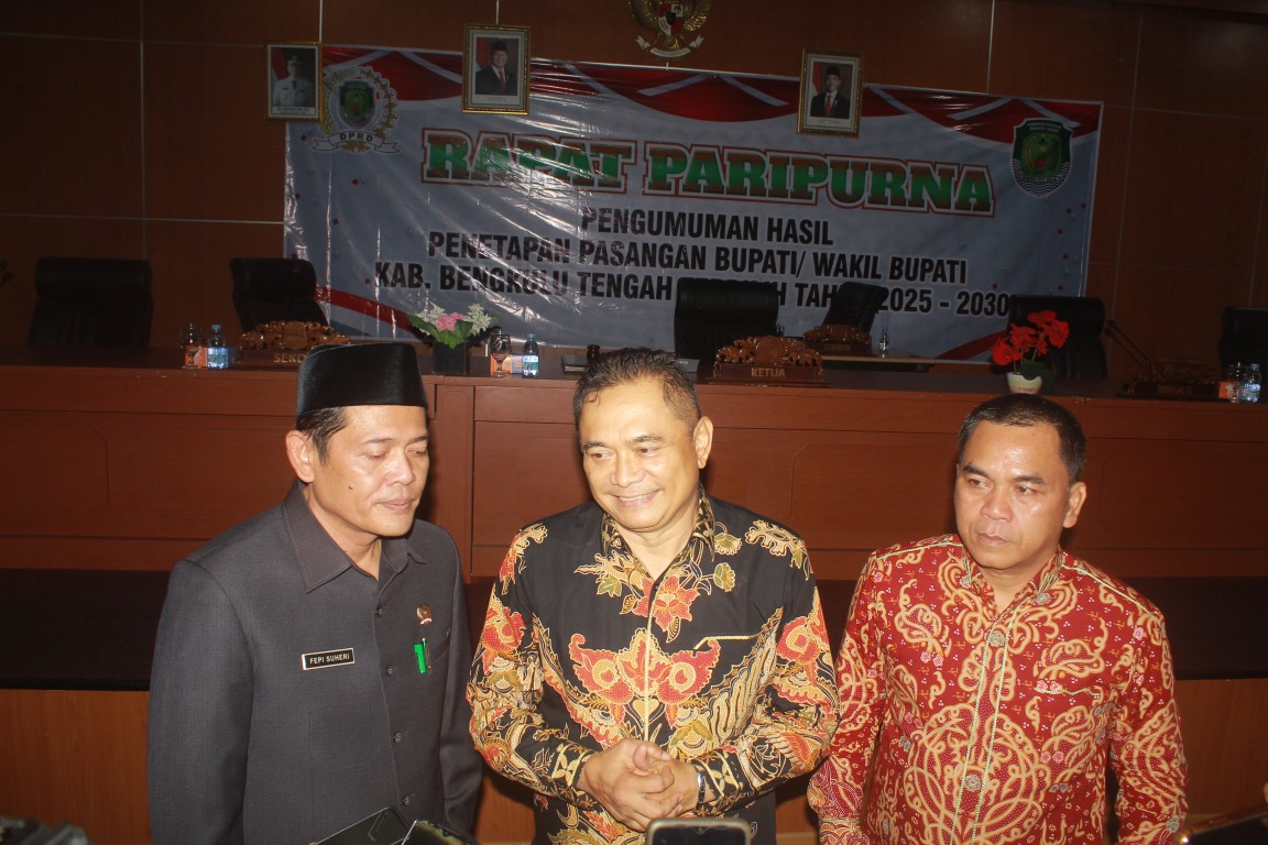 “Dalam rapat paripurna DPRD Bengkulu Tengah ini kami umumkan bahwa saudara Rachmat Riyanto, S.STP., M.AP., adalah Bupati Kabupaten Bengkulu Tengah terpilih masa jabatan tahun 2025-2030 dan saudara Tarmizi, S.Sos., adalah Wakil Bupati Kabupaten Bengkulu Tengah terpilih masa jabatan tahun 2025-2030. Dengan telah diumumkan pasangan Bupati dan Wakil Bupati Kabupaten Bengkulu Tengah terpilih, maka izinkan kami menandatangani berita acara pengumuman pasangan Bupati dan Wakil Bupati Kabupaten Bengkulu Tengah terpilih masa jabatan tahun 2025-2030. Kami atas nama pimpinan dan seluruh anggota DPRD Kabupaten Bengkulu Tengah menyambut hangat dan menyampaikan ucapan selamat kepada Bupati dan Wakil Bupati Kabupaten Bengkulu Tengah terpilih. Dengan harapan saudara-saudara dapat bekerjasama dengan DPRD Kabupaten Bengkulu Tengah, membangun kemitraan dalam mengemban tugas yang mulia ini dalam upaya meningkatkan pelayanan dan pengabdian kepada masyarakat Kabupaten Bengkulu Tengah serta melanjutkan pembangunan dan pemberdayaan masyarakat yang belum selesai oleh Bupati dan Wakil Bupati yang terdahulu. Terimakasih Kepada semua pihak yang telah mensukseskan proses pelaksanaan pilkada serentak Bupati dan Wakil Bupati Kabupaten Bengkulu Tengah pada tanggal 27 November Tahun 2024,” katanya.