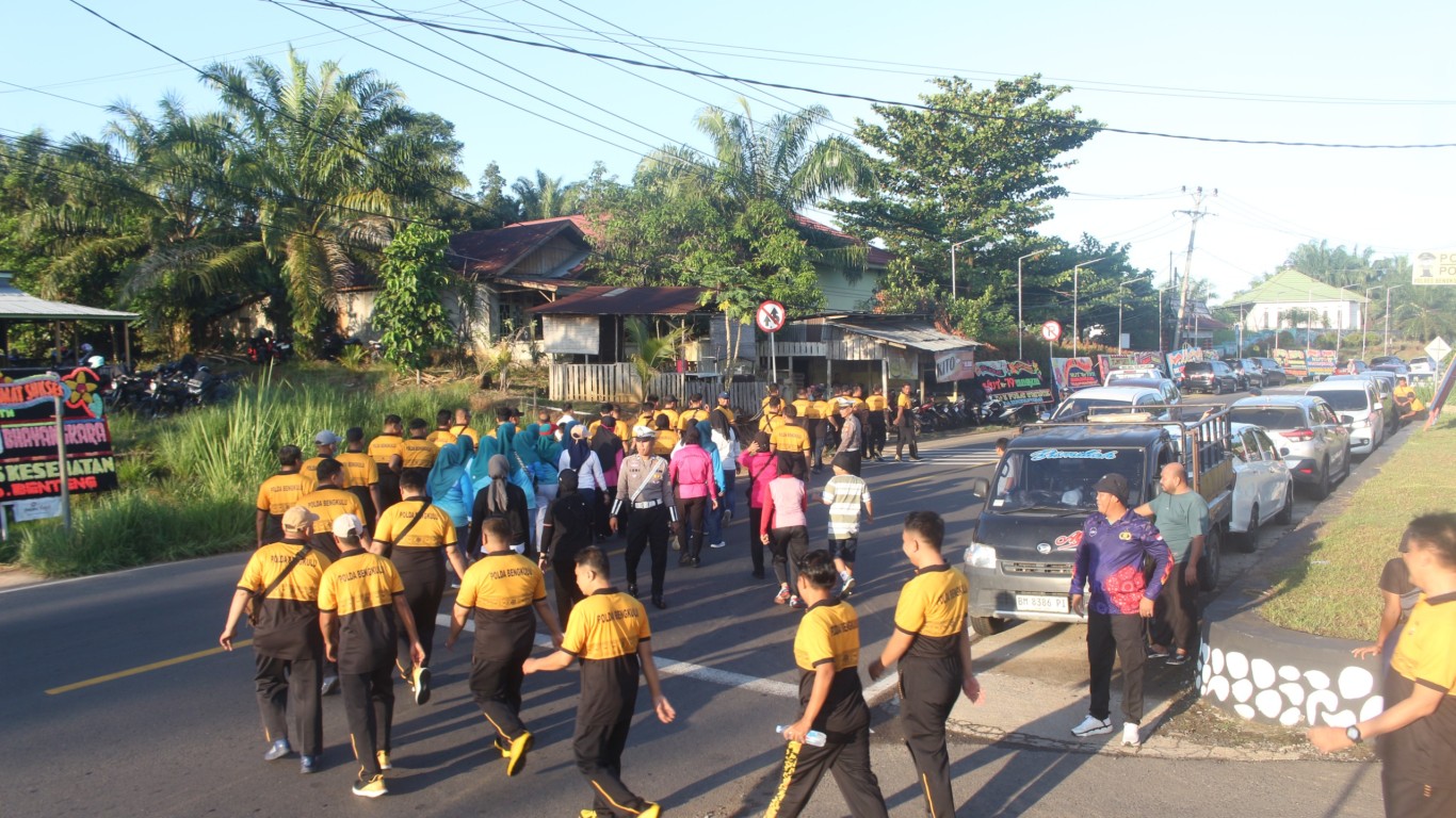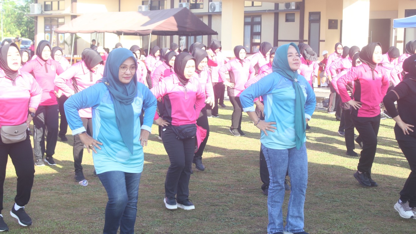 Kegiatan diawali dengan jalan santai mengelilingi area sekitar Mapolres, kemudian dilanjutkan dengan senam bersama yang berlangsung penuh semangat. Atmosfer kegembiraan dan kebersamaan sangat terasa, memperlihatkan antusiasme peserta dari berbagai kalangan yang hadir.