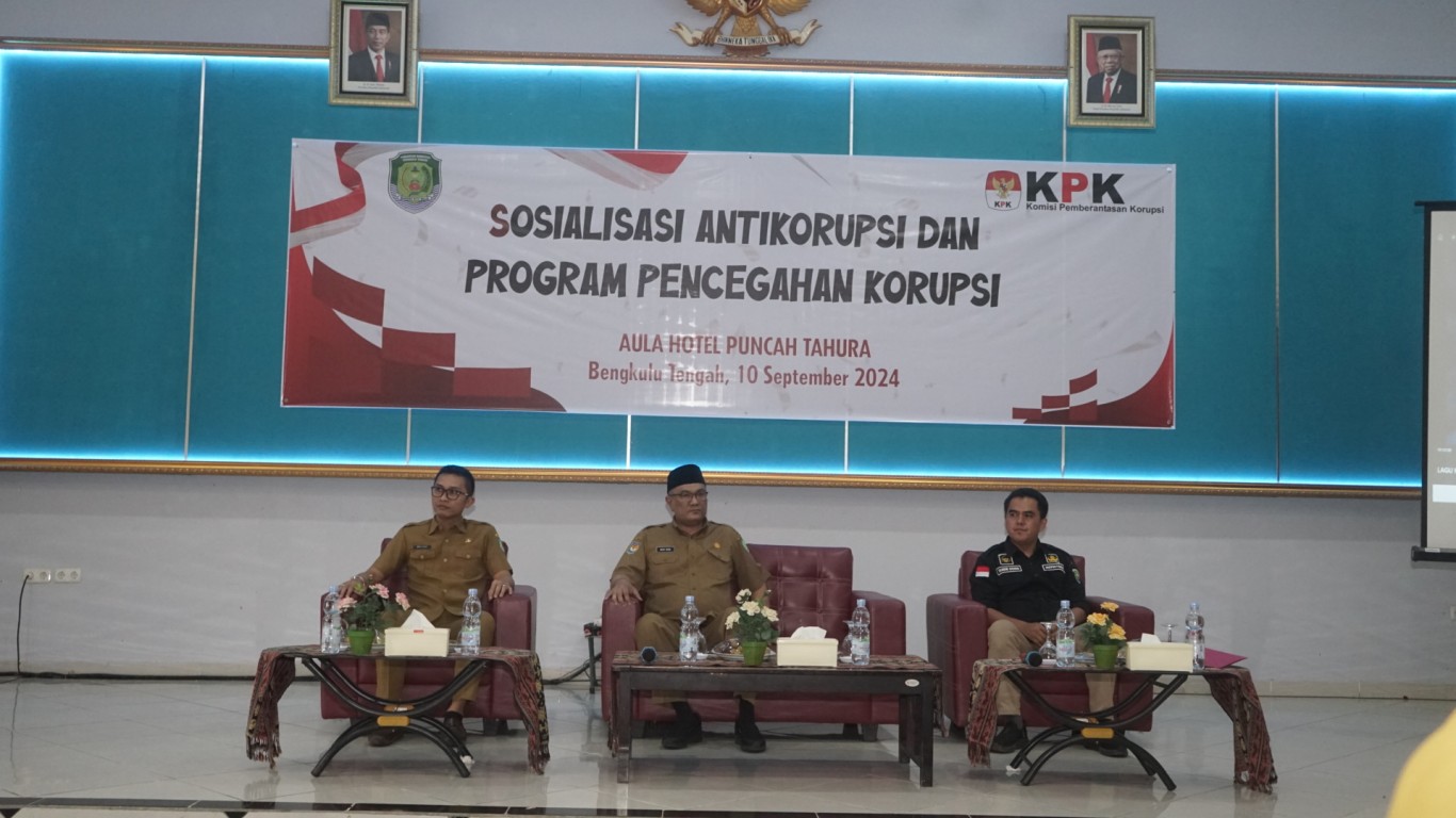 " Para peserta Sosialisasi Anti Korupsi ini di bagi menjadi tiga tahap, untuk hari ini kegiatan sosialisasi di fokuskan pada Pemerintahan Desa yaitu para Kepala Desa dan Ketua BPD, selanjutnya nanti bagi para Eksekutif atau para pejabat di Pemerintahan dan yang terakhir untuk Legislatif yaitu para anggota DPRD Bengkulu Tengah. Kami berharap kegiatan ini dapat memberikan pemahaman kepada seluruh peserta agar menghindari bahkan tidak melakukan Korupsi, sehingga di Kabupaten Bengkulu Tengah angka Korupsi menjadi Zero Corruption," tutupnya
