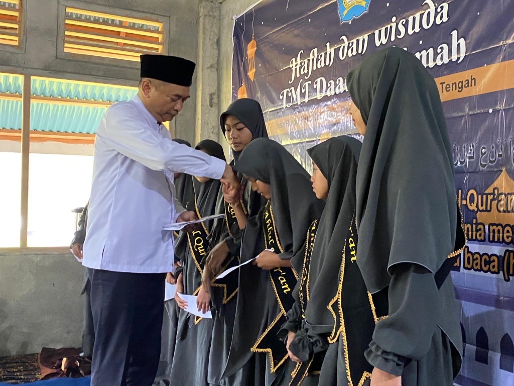Rachmat Riyanto, S.T.,M.AP juga memberikan uang saku kepada para wisudawan Tahfidz Qur’an Pesantren Daarul Hikmah.(MC/AA)