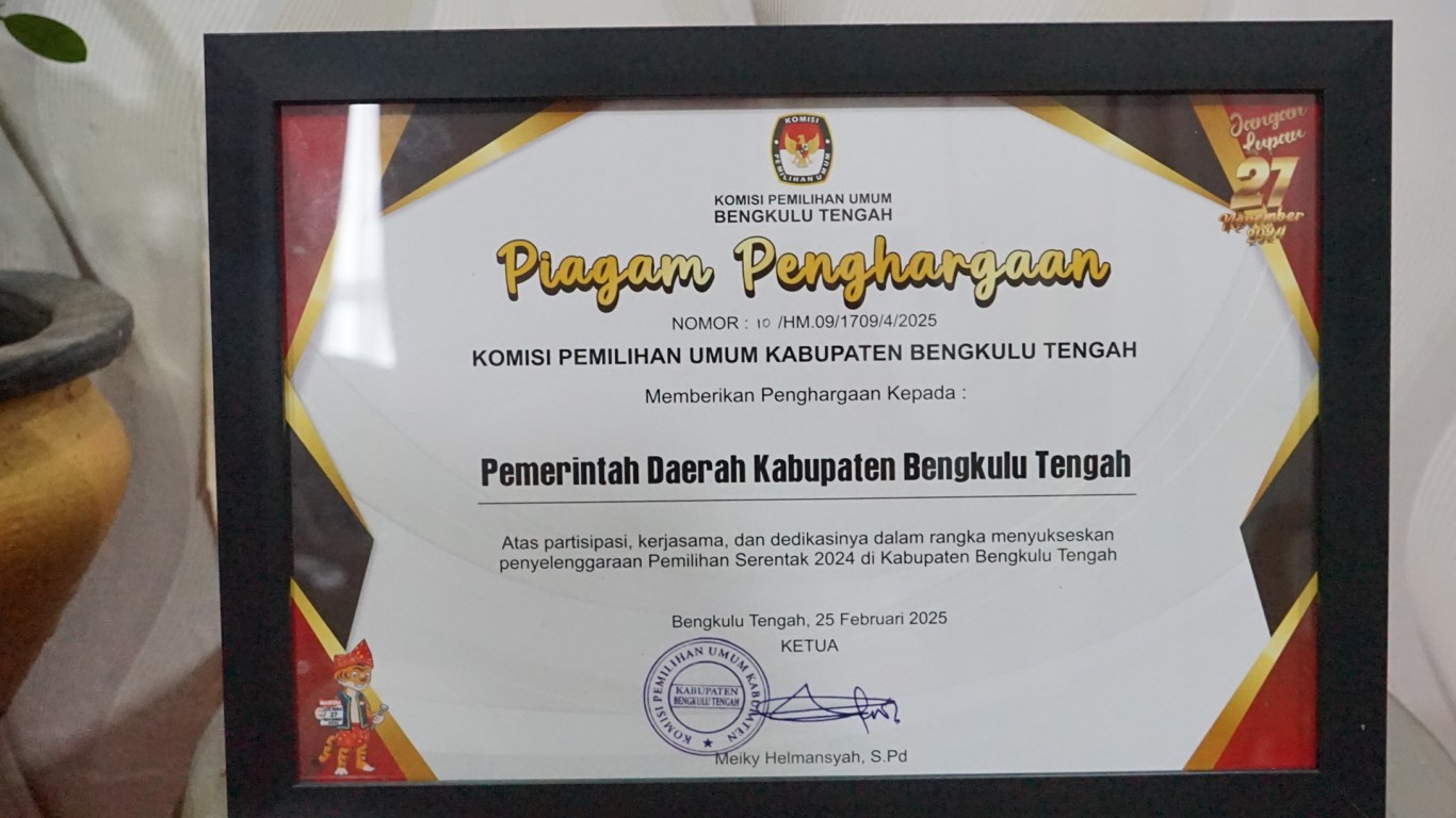 Bengkulu Tengah, MC Benteng - Pemerintah Kabupaten Bengkulu Tengah menerima piagam penghargaan dari Komisi Pemilihan Umum (KPU) Bengkulu Tengah atas partisipasi, kerjasama dan dedikasinya dalam rangka menyukseskan penyelenggaraan pemilihan umum serentak tahun 2024 bertempat di Ruang Kerja Bupati (RKB) Kantor Bupati Bengkulu Tengah. Senin (17/3/2025)