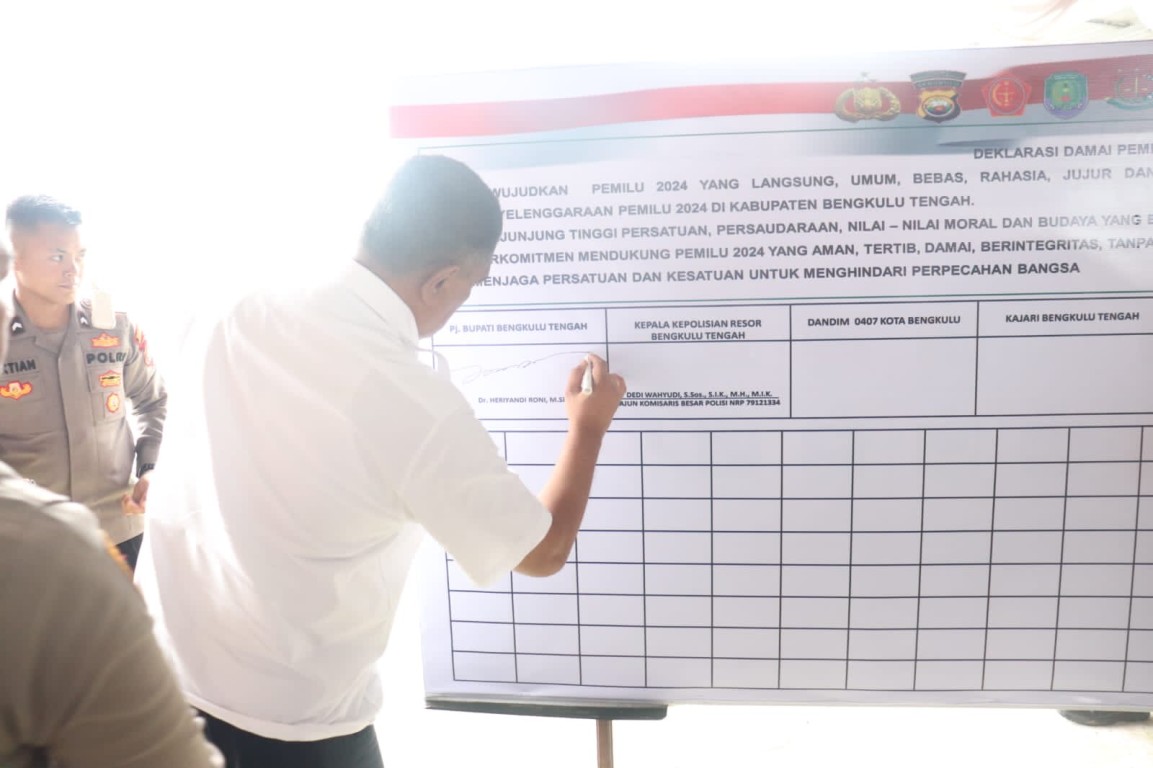 Acara dilanjutkan dengan pembacaan ikrar oleh Aparatur Desa dan Camat se-Kabupaten Bengkulu Tengah dan penanda tanganan deklarasi pemilu damai yang diawali oleh PJ. Bupati Bengkulu Tengah dan dilanjutkan oleh peserta lainnya. (MC/TIM)