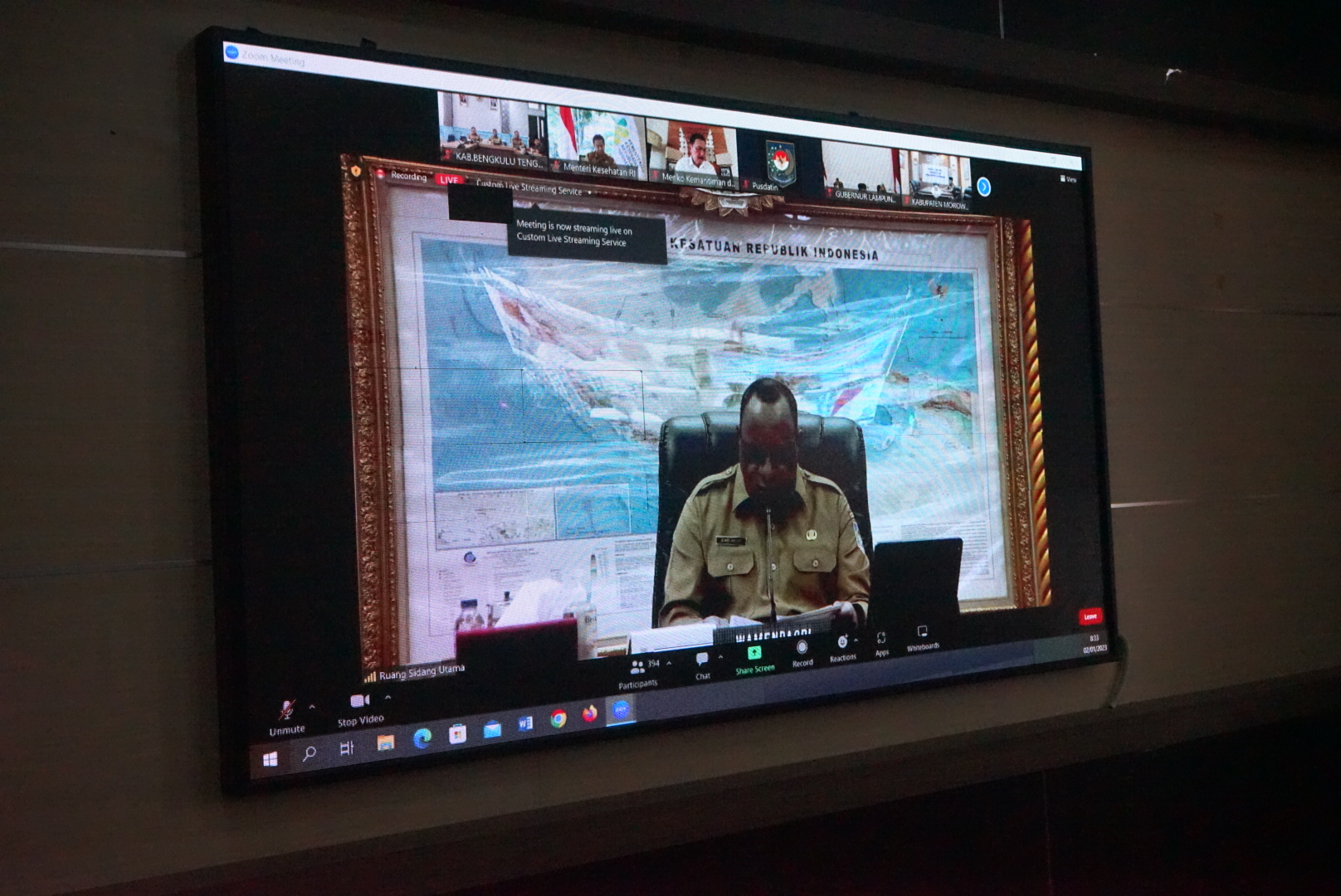 PJ. BUPATI MENGHADIRI RAKOR KEMENDAGRI TENTANG PENCABUTAN PPKM MELALUI ZOOM MEETING