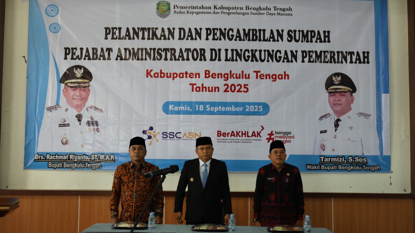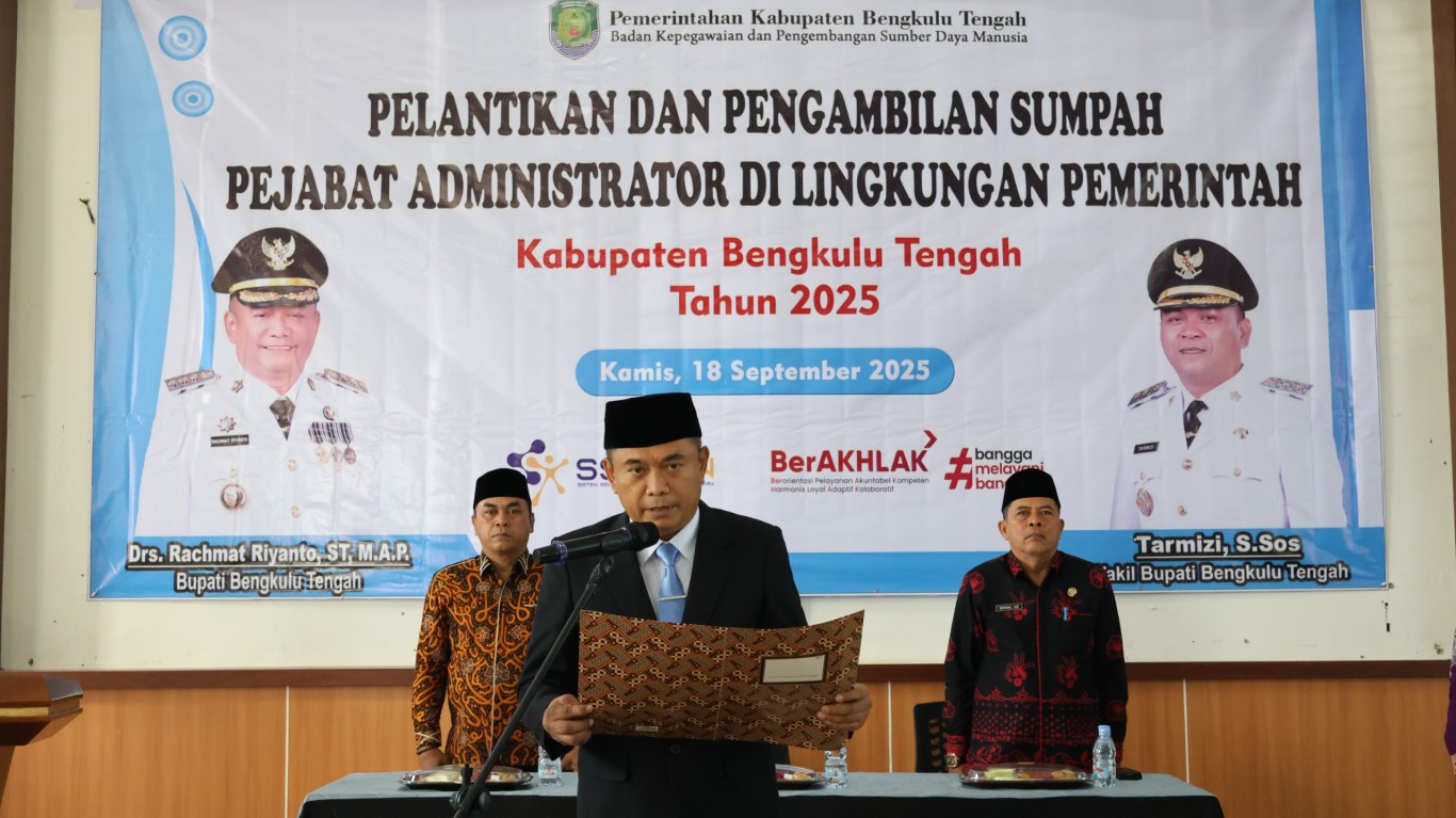 Bengkulu Tengah, MC Benteng – Bupati Bengkulu Tengah Drs. Rachmat Riyanto, S.T., M.A.P., melantik dan mengambil sumpah 63 pejabat administrator (eselon III) di lingkungan Pemerintah Kabupaten Bengkulu Tengah. Prosesi pelantikan digelar di Pendopo Bukit Kandis, Kamis (18/09/2025).