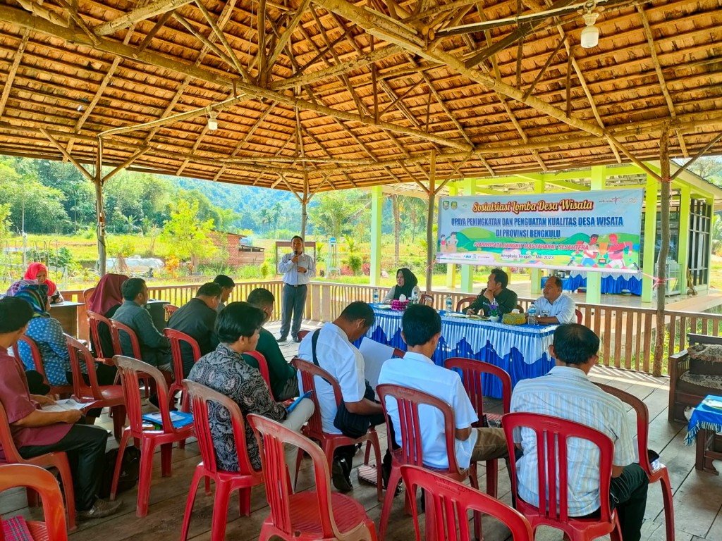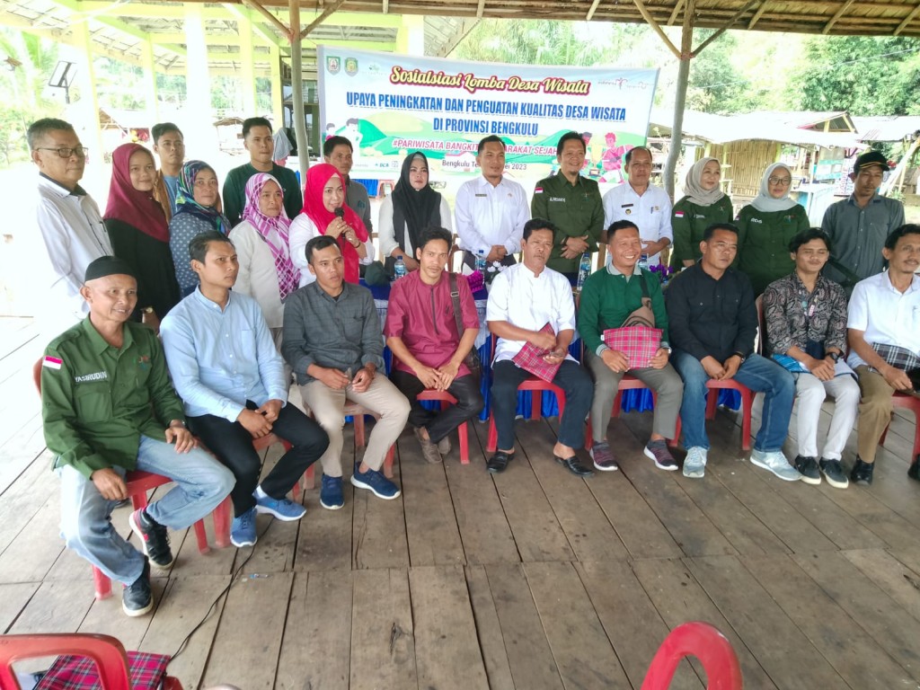 Bengkulu Tengah – Sebagai upaya peningkatan dan penguatan kualitas desa wisata, Dinas Pariwasata (Dispar) Provinsi Bengkulu bersama Dinas Pariwisata (Dispar) kabupaten Bengkulu Tengah melaksanakan sosialisasi lomba desa wisata kegiatan dilaksanakan di Desa Rindu Hati, Rabu (31/05/2023).